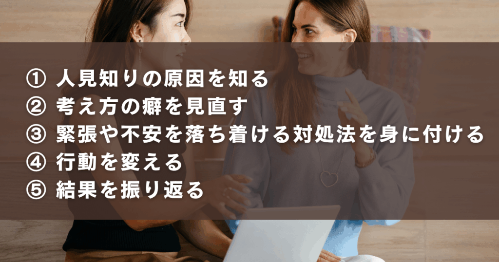 次に、人見知りを克服するための具体的な方法を5ステップで解説します。
