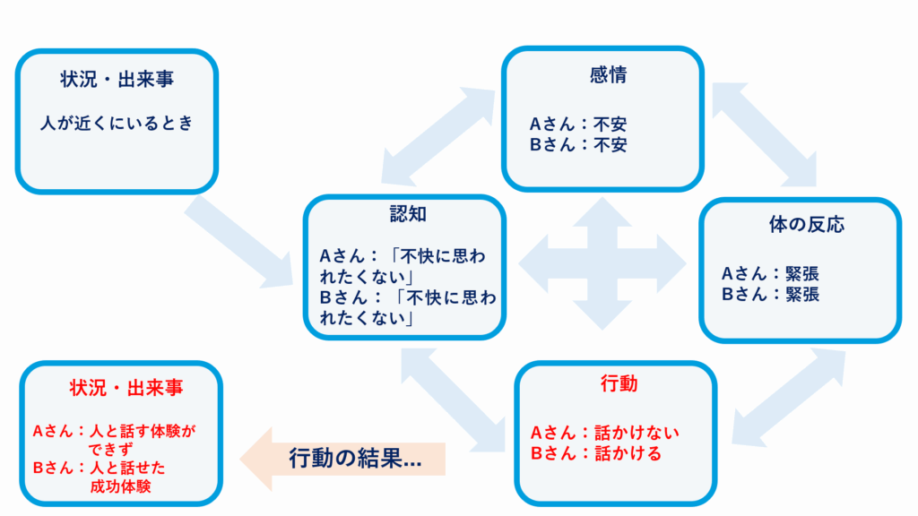 一方、Bさんは「不快に思われたくない」と考えつつも、「話かける」という行動を選択したことで、「意外と大丈夫だった」という体験かできるかもしれません。